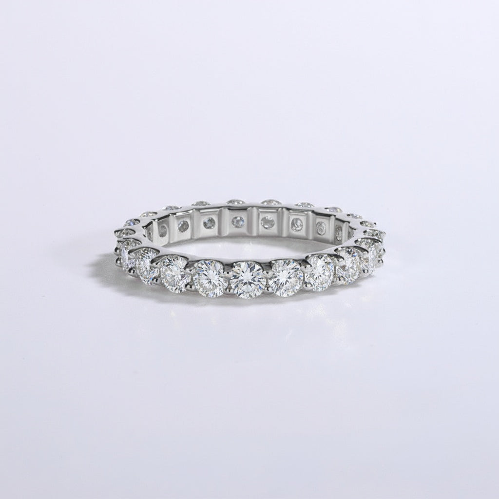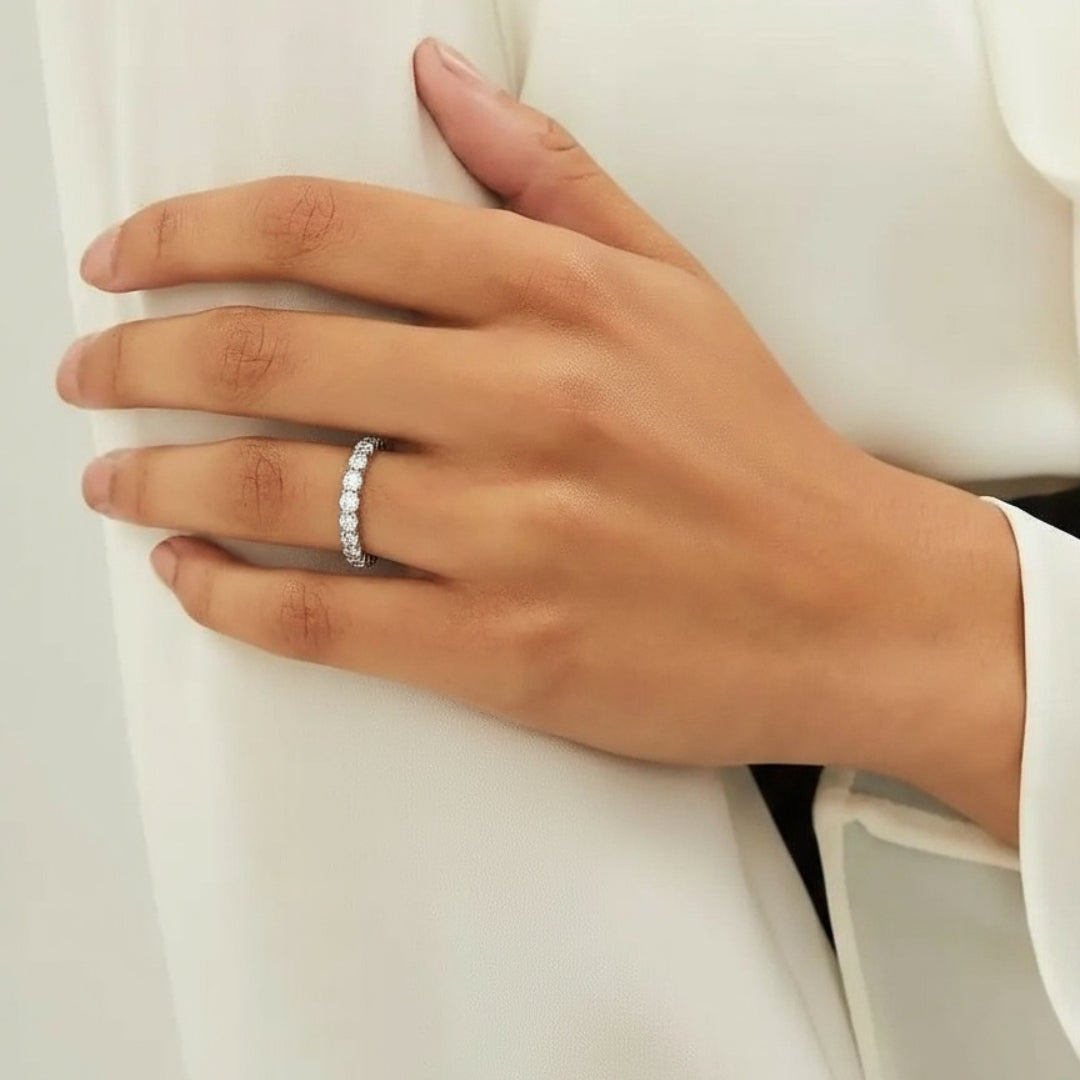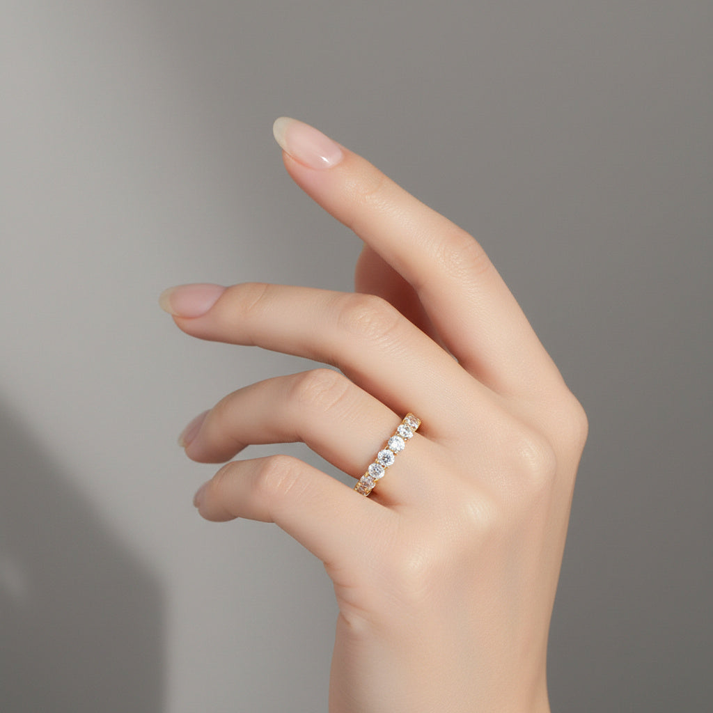 Grace in its purest form — the Clarté Band is a seamless circle of brilliance, where every stone is hand-set to reflect the quiet strength of eternal love. Its bezel-style design offers a modern interpretation of the classic eternity ring, catching the light with a soft, fluid shimmer from every angle.