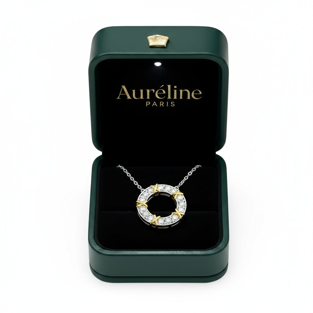 A continuation of the Croisée collection, this necklace embodies unity through contrast. Interlaced gold accents embrace a circle of precision-cut lab-grown Auréline Gems™ — symbolizing balance, wholeness, and the art of restraint.