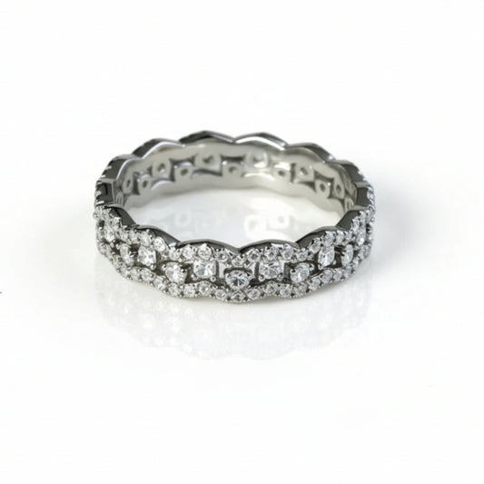Its centerpiece, cut to perfection - mirrors the clarity and fire of a diamond, while the pavé-set band scatters light with every movement, creating a liquid shimmer effect along the hand.